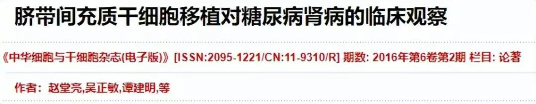 2016年《中華細(xì)胞與干細(xì)胞雜志》報(bào)道了第二軍醫(yī)大學(xué)臨床醫(yī)學(xué)院進(jìn)行臍帶間充質(zhì)干細(xì)胞移植干預(yù)糖尿病腎病的臨床案例,這場臨床研究共有15名糖尿病腎病患者。[1]