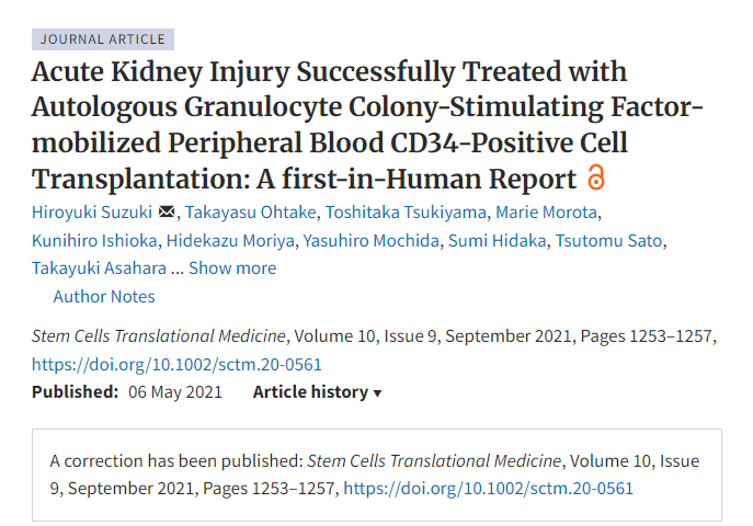 [1]Hiroyuki Suzuki, Takayasu Ohtake, Toshitaka Tsukiyama, Marie Morota, Kunihiro Ishioka, Hidekazu Moriya, Yasuhiro Mochida, Sumi Hidaka, Tsutomu Sato, Takayuki Asahara, Shuzo Kobayashi, Acute Kidney Injury Successfully Treated with Autologous Granulocyte Colony-Stimulating Factor-mobilized Peripheral Blood CD34-Positive Cell Transplantation: A first-in-Human Report,?Stem Cells Translational Medicine, Volume 10, Issue 9, September 2021, Pages 1253–1257,?https://doi.org/10.1002/sctm.20-0561
