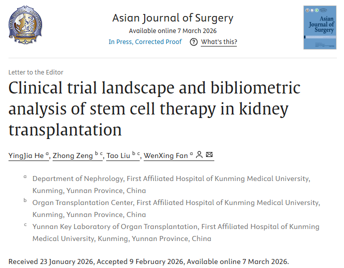 近期,《Asian Journal of Surgery》發表了一篇題為《腎移植中干細胞療法的臨床試驗概況及文獻計量分析》的綜述。該研究整合了臨床試驗注冊數據與文獻計量學方法,系統描繪了該領域的研究現狀、演進脈絡與前沿趨勢,以期為后續研究與臨床決策提供參考[1]。