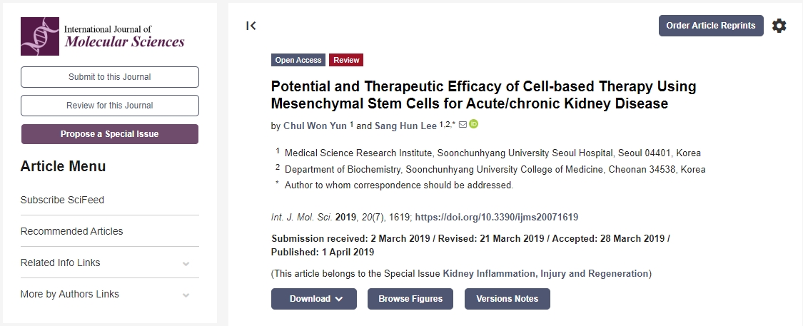2019年,韓國順天鄉大學首爾醫院在《國際分子科學雜志》發布了一篇使用“間充質干細胞治療急性/慢性腎臟病的潛力和治療效果”的論文,這篇綜述討論了最近與腎臟疾病相關的實驗和臨床發現,重點討論了間充質干細胞在腎臟疾病的療效和臨床應用。