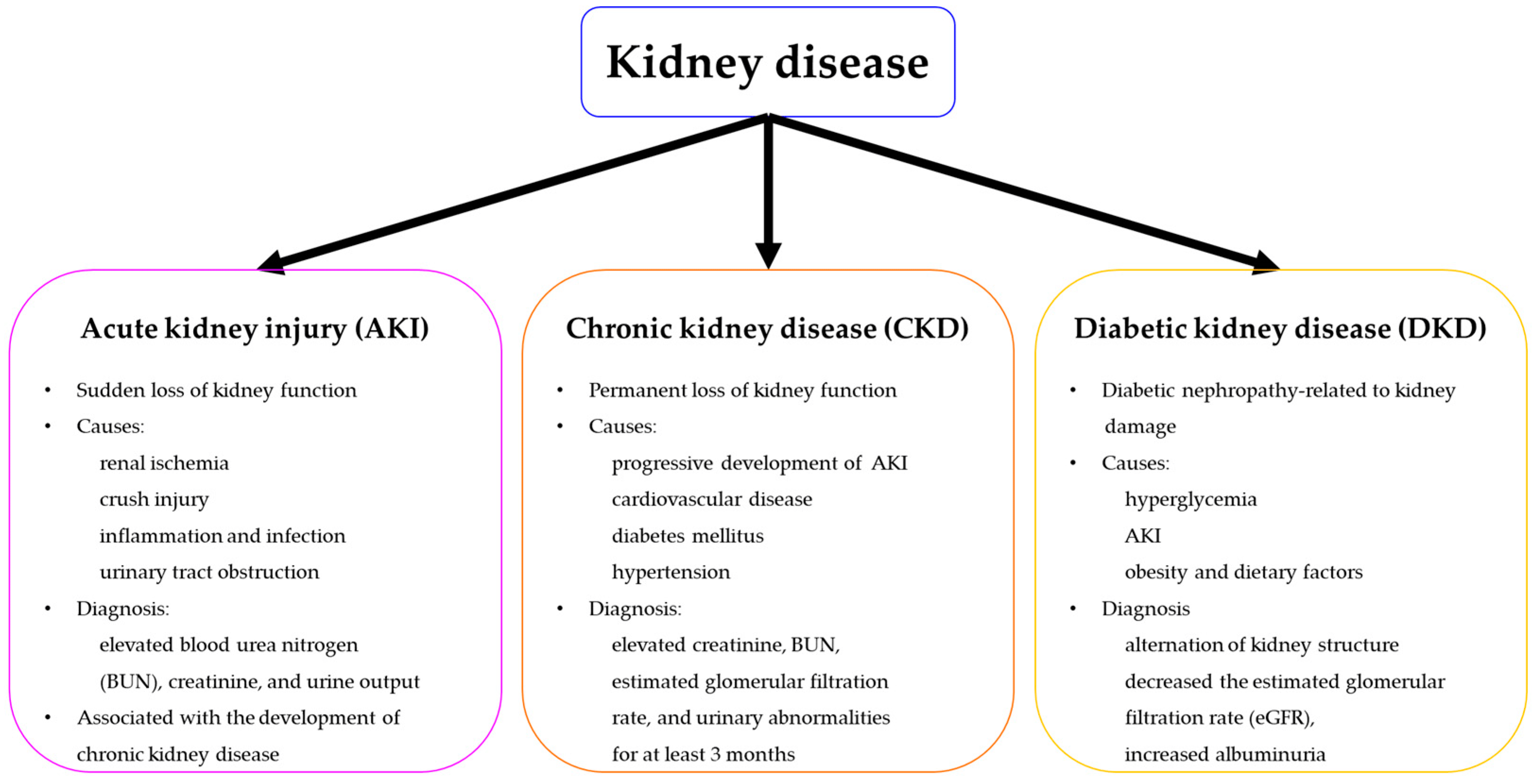 急性腎損傷(AKI):其特征是突發性腎衰竭或腎功能迅速喪失。AKI有許多潛在原因,包括低血壓引起的腎缺血、擠壓傷、炎癥和尿路梗阻或感染。它是根據升高的血尿素氮 (BUN) 和肌酐濃度,或減少尿量來診斷的。