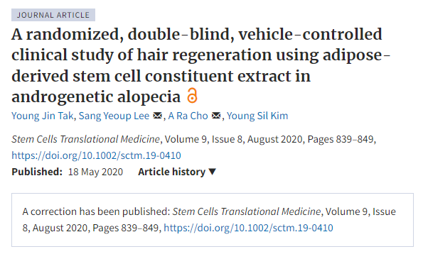 韓國的一項隨機、雙盲、藥物對照試驗使用脂肪干細(xì)胞成分提取物 (ADSC-CE) 治療AGA,證實了治療效果。