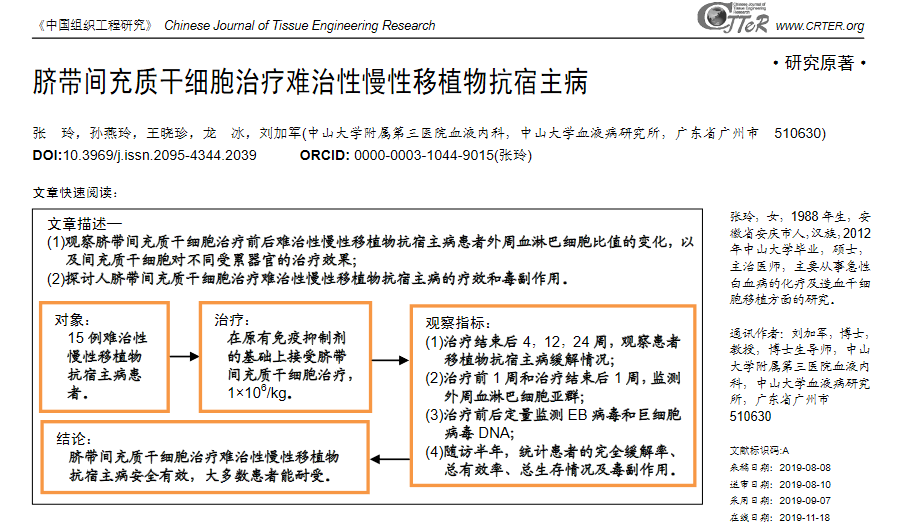 臨床案例:發(fā)表在《中國組織工程研究》雜志的一篇臨床研究成果,中山大學(xué)附屬第三醫(yī)院采用臍帶間充質(zhì)干細(xì)胞治療15例造血干細(xì)胞移植后難治性慢性移植物抗宿主病患者,研究結(jié)果顯示:臍帶間充質(zhì)干細(xì)胞療法的有效率為73.3%,輸注期間未發(fā)現(xiàn)明顯不良反應(yīng),干細(xì)胞治療安全有效。