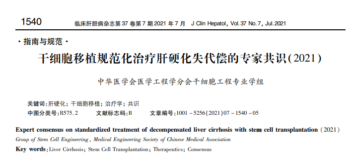 2021年,中華醫(yī)學(xué)會醫(yī)學(xué)工程學(xué)分會干細(xì)胞工程專業(yè)學(xué)組頒布《干細(xì)胞移植規(guī)范化治療肝硬化失代償?shù)膶<夜沧R(2021)》。