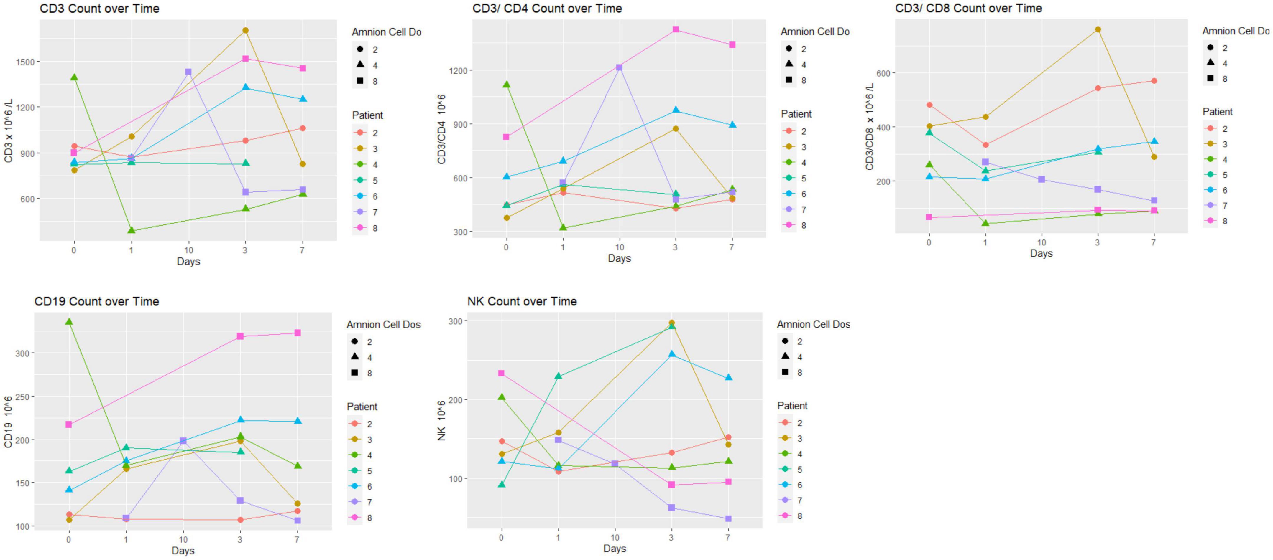 免疫學(xué)變化如圖3、4所示。在這8名患者中沒(méi)有觀察到特殊的模式。簡(jiǎn)而言之,結(jié)果沒(méi)有顯示出明顯的趨勢(shì),特別是在hAEC的效果方面(例如,接受最高劑量的患者7和8與接受最低劑量的患者1-3之間)。我們無(wú)法檢測(cè)(或檢測(cè)到低水平)幾種炎癥標(biāo)志物(IFN-γ、IL-6、TNF、IL-10和IL-17)。高敏CRP和MMP-9水平保持在正常范圍內(nèi)。在三名患者(患者1-3)中,MMP-9水平在第一周內(nèi)沒(méi)有變化。