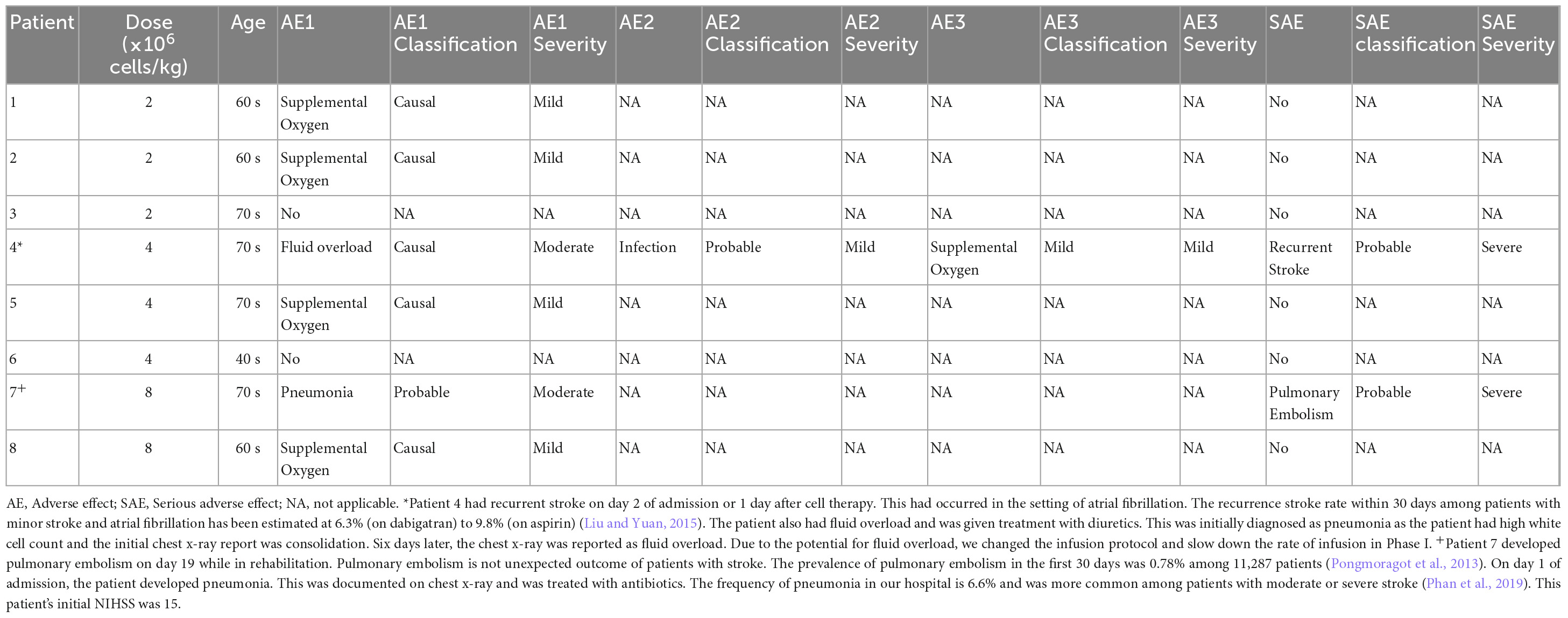 對(duì)于最后四名患者,hAEC的輸注在隨后的幾天中分次進(jìn)行,以降低液體超負(fù)荷的風(fēng)險(xiǎn)(表2)。這使我們能夠?qū)AEC的劑量增加至8×10^6個(gè)細(xì)胞/kg。5名患者在hAEC輸注期間給予補(bǔ)充氧氣(表3)。這些患者在細(xì)胞治療過(guò)程結(jié)束時(shí)不需要氧療。使用預(yù)先定義的標(biāo)準(zhǔn),發(fā)生了兩起嚴(yán)重的不良事件。一名患者因房顫入院2天后復(fù)發(fā)性中風(fēng)(患者4),另一名患者19天后在康復(fù)過(guò)程中出現(xiàn)肺栓塞(患者7)。試驗(yàn)入組后一年內(nèi)沒(méi)有患者死亡。