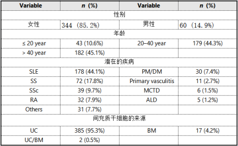 南京大學醫學院附屬鼓樓醫院風濕免疫科的梁軍、張華勇、孔偉等研究人員開展的大規模研究,全面探討了間充質干細胞治療自身免疫性疾病的安全性;發表在《干細胞研究與治療》上。研究人員對2007年至2016年在該醫院接受MSCI治療的404例不同自身免疫性疾病患者,平均年齡在輸注時為38.7歲(含26名未成年人)跟蹤觀察從1個月到9年,進行了回顧性研究。
