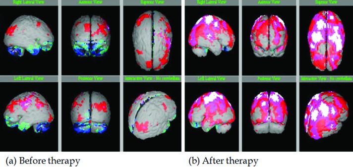 在我們的機構(gòu),患者接受了hESC治療作為主要治療。經(jīng)過四次治療后,他的認知能力和溝通能力都有所提高。他的手眼協(xié)調(diào)能力得到了改善,言語能力也得到了改善,并且可以同時完成多項任務。他對嗅覺/聽覺刺激的過敏減輕了,身體變得強壯,免疫系統(tǒng)也得到了改善。治療后,2013年7月1日對他進行的SPECT掃描顯示腦灌注流量正常。在大腦和小腦區(qū)域觀察到的灌注程度顯著降低(圖2)。