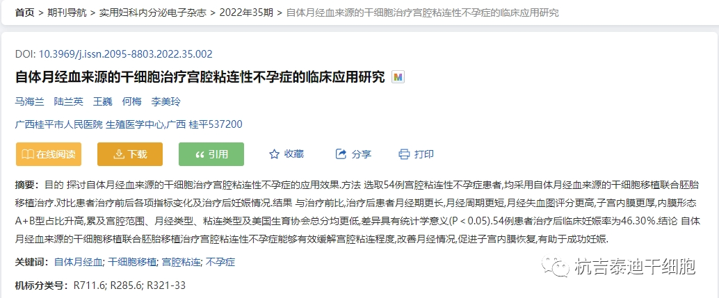 近期,廣西桂平市人民醫院發表了一項《自體月經血來源的干細胞治療宮腔粘連性不孕癥的臨床應用研究》,該發表在實用婦科內分泌電子雜志上。