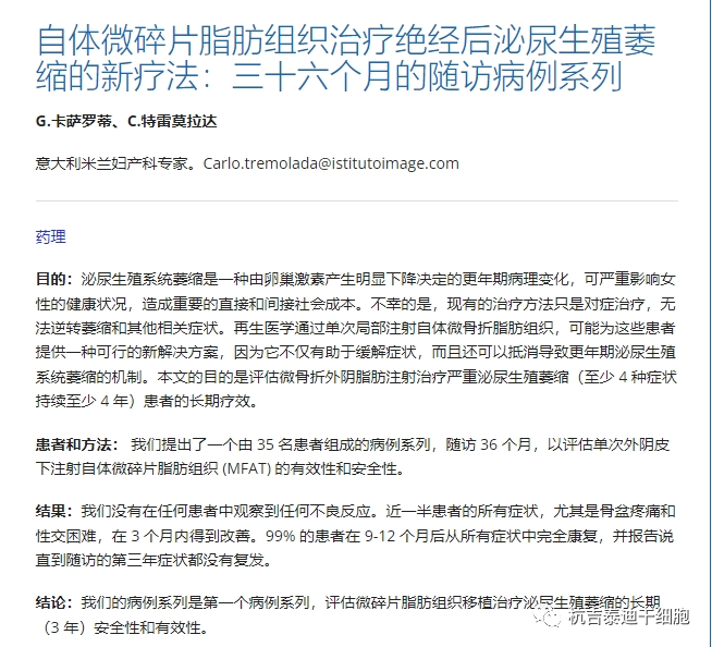 與迄今為止可用的所有其他療法(例如激光療法、射頻、磁刺激、局部雌激素療法等)相比,GSM治療的這些結果使MSC成為最持久的療法,并且由于沒有描述任何副作用,也完全安全。