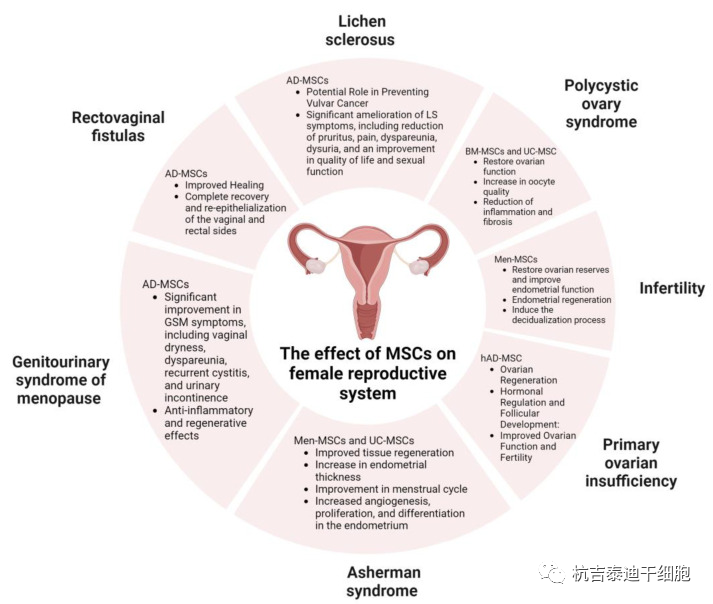 干細胞在醫學領域的潛力是極其積極的(下圖)。通過再生、分化、免疫調節、血管生成、抗氧化、抗凋亡等機制,它們帶來了新的治療模式并成功治療了許多疑難疾病。特別是在婦科領域,這些病癥的例子包括不孕癥、多囊卵巢綜合征、阿謝曼綜合征、GSM、直腸陰道瘺、硬化性苔蘚和卵巢早衰。