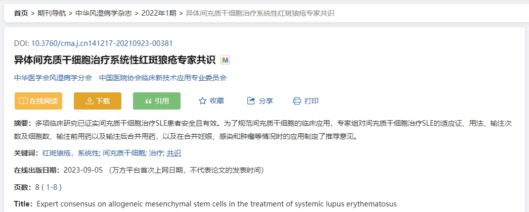 2022年,中華風濕病學雜志發表了《異體間充質干細胞治療系統性紅斑狼瘡專家共識》,文章概述了多項臨床研究已證實間充質干細胞治療SLE患者安全且有效。為了規范間充質干細胞的臨床應用,專家組對間充質干細胞治療SLE的適應證、用法、輸注次數及細胞數、輸注前用藥以及輸注后合并用藥,以及在合并妊娠、感染和腫瘤等情況時的應用制定了推薦意見。