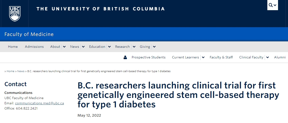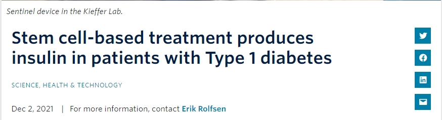 根據不列顛哥倫比亞大學(UBC)和溫哥華海岸醫療中心(VCH)的最新臨床試驗結果,一種基于干細胞治療1型糖尿病得創新療法可以有效調節血糖水平,減少對每日注射胰島素的依賴。