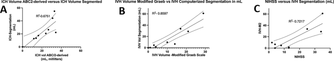 ABC/2模型1和模型2分割方法通過ICH和IVH體積的線性回歸顯示出良好的相關性(圖3a、b)。與模型2分割體積方法(例如,每個CT15-20分鐘)相比,模型1ABC/2派生的半定量方法和改進的Graeb IVH方法完成時間較短(例如,2-5分鐘)。有趣的是,NIHSS評分與IVH體積M2方法的比較顯示出線性相關性(R 2 ?= 0.7217),并且當IVH小于20mL或大于20mL時,NIHSS評分似乎出現聚類(圖3c)。PHE分析顯示MSC注射劑量和PHE體積之間存在輕微的負相關關系。