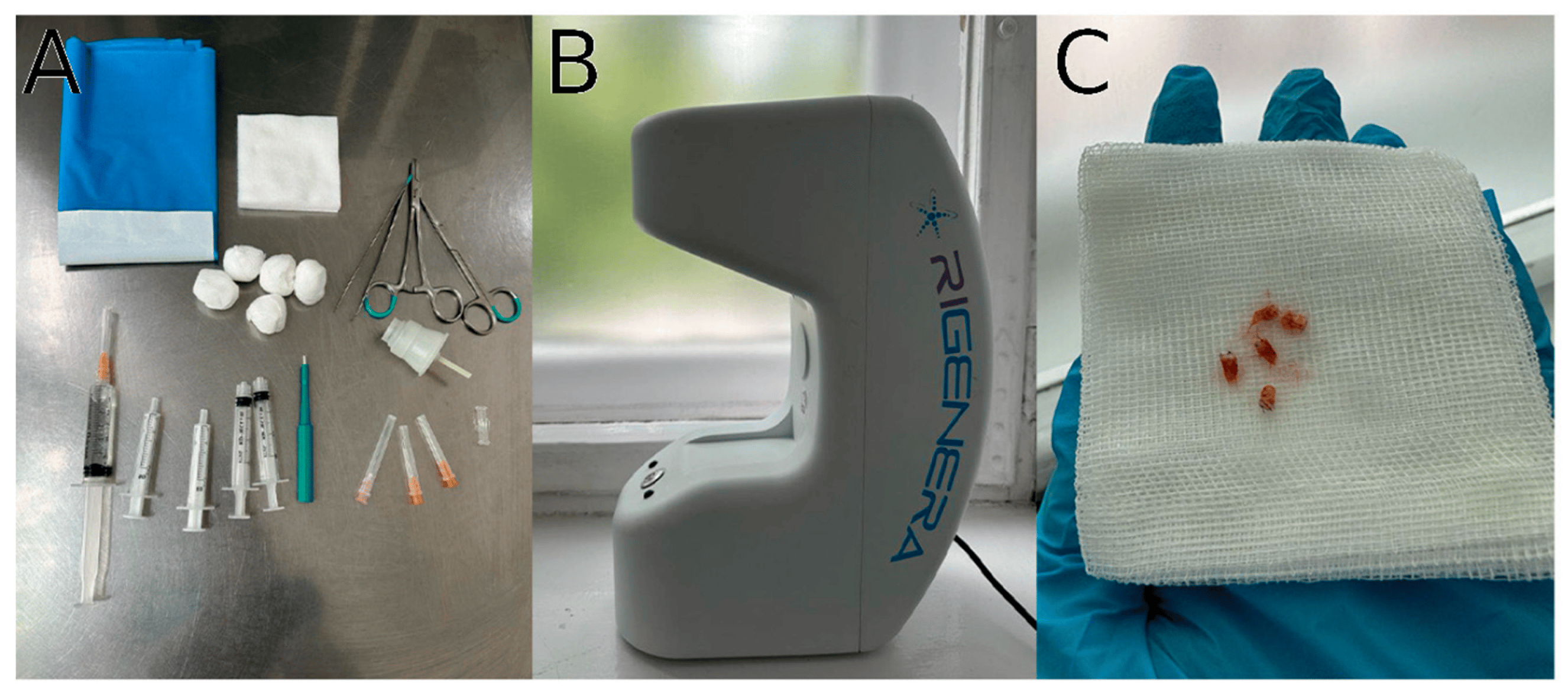 必要的工具包(A);Rigenera?I類醫療器械(B);耳后皮膚的五個微移植活檢組織(C)。
