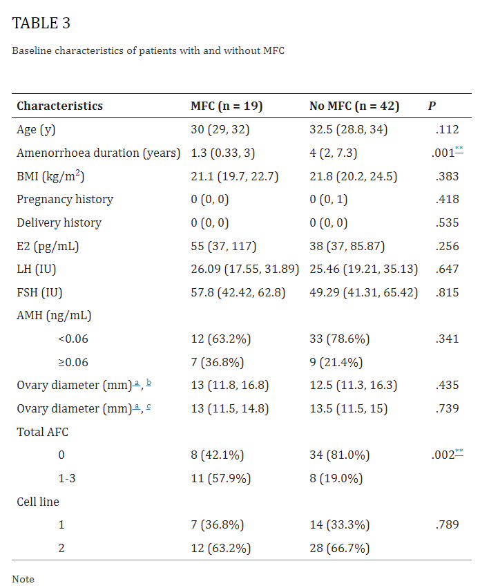為了確認治療效果與治療之前之間的關系,我們比較了19名在UCMSC注射后獲得成熟卵泡的患者和其他 42名未發育成熟卵泡的患者的基本臨床特征。MFC患者的中位年齡為30歲,閉經持續時間為1.3年。這些MFC患者的E2血激素水平有高于無MFC組的趨勢,兩組之間LH和FSH水平沒有差異。作為卵巢儲備的有效指標,還測試了AMH水平。總體而言,MFC組36.8%的AMH水平≥0.06ng/mL,而無MFC組的比例為 21.4%。