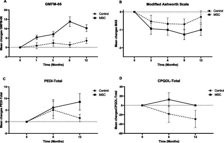 每組有36名參與者。與基線和對照組相比,臍帶間充質干細胞移植組干預12個月后的平均GMFM-66評分顯著更高。PEDI總分也有所增加。