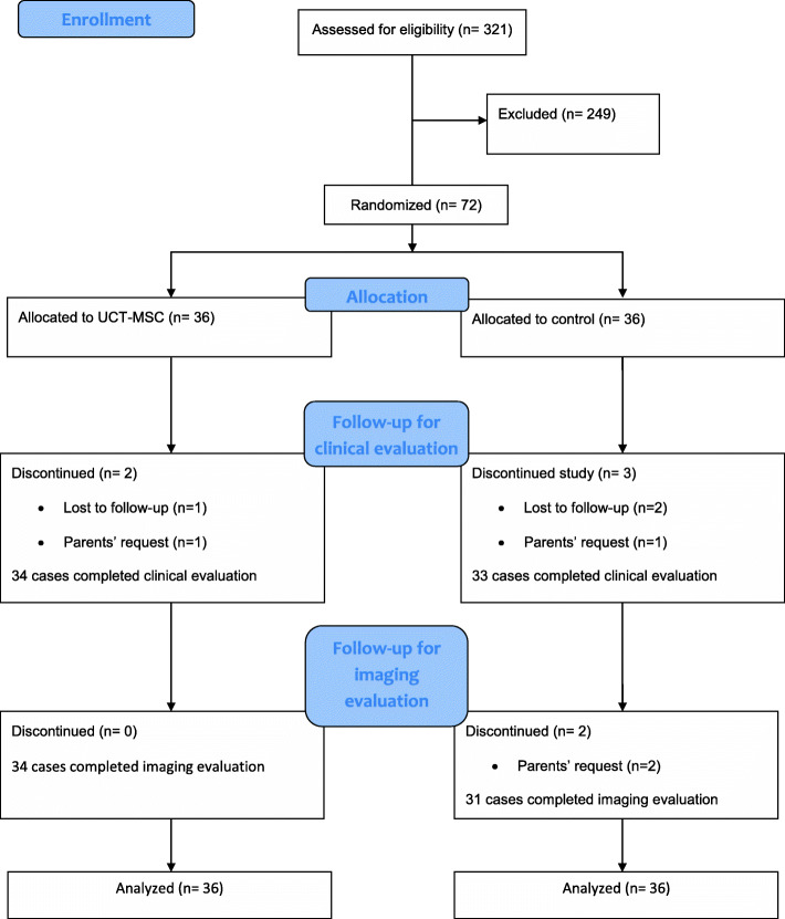 患有痙攣性CP的參與者(4-14歲)按1:1的比例分配接受UCT-MSC或假手術。實驗組給予單劑量(2×107)細胞。在假對照臂中對下背部進行小針刺。所有人都被鎮靜以防止意識。