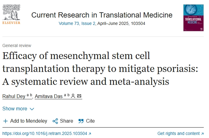 近期,國際期刊Current Research in Translational Medicine發表題為’Efficacy of mesenchymal stem cell transplantation in alleviating psoriasis: a systematic review and meta-analysis’的綜述[1]。