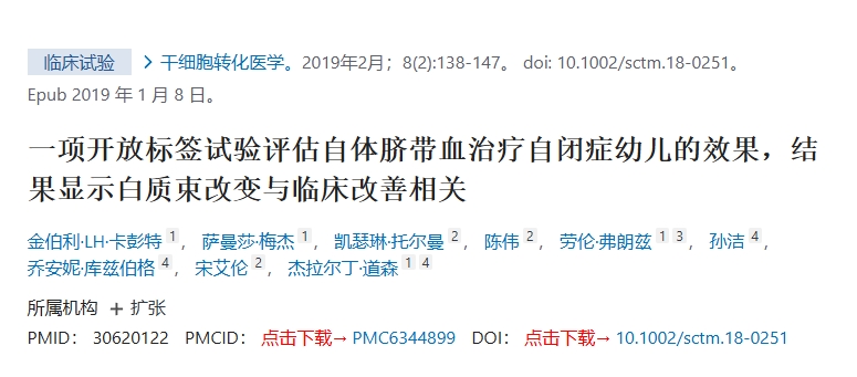 2019年,Carpenter等人進行了”一項開放標簽試驗評估自體臍帶血治療自閉癥幼兒的效果,結果顯示白質束改變與臨床改善相關“的研究,通過輸注自體臍帶血單核細胞進行了擴散張量纖維束成像檢查。雖然成像數據觀察到輕微改善,但研究人員報告稱社交和溝通技巧也有輕微提高。