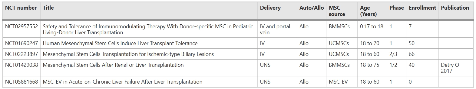 肝移植用于恢復終末期肝病或肝功能衰竭患者的肝功能;然而,其并發癥常常導致死亡。迄今為止,已開展了五項基于同種異體MSC的試驗,其中兩項使用BMMSC,兩項使用UCMSC,一項使用EVs,用于治療或預防肝移植相關并發癥(表6)。