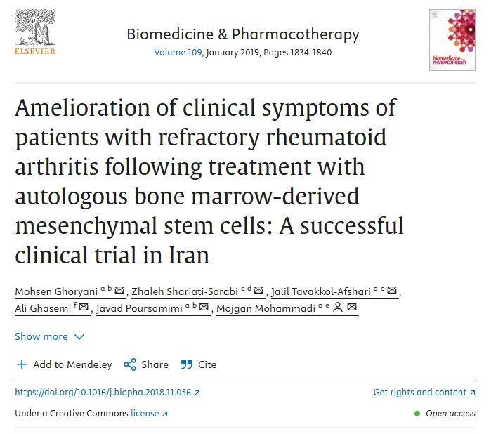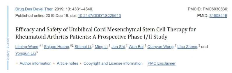 2019年,伊朗科研人員在期刊雜志《生物醫學與藥物治療學》上發表了一篇“自體骨髓間充質干細胞治療后難治性類風濕性關節炎患者臨床癥狀改善的臨床試”的文章。