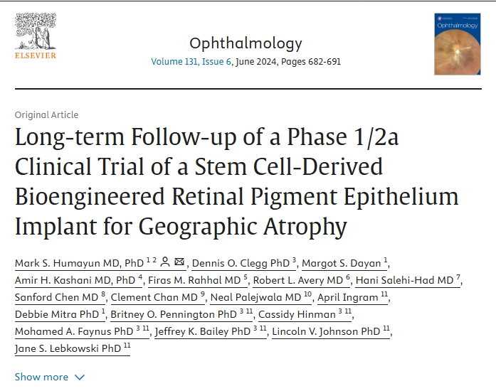 2024年,一項(xiàng)“干細(xì)胞衍生的生物工程視網(wǎng)膜色素上皮植入物治療地圖狀萎縮的1/2a期臨床試驗(yàn)的長期隨訪”試驗(yàn)報(bào)告顯示,基于支架的hESC衍生的RPE植入物是安全的,并且在中位三年的隨訪中顯示出良好的視力改善效果。