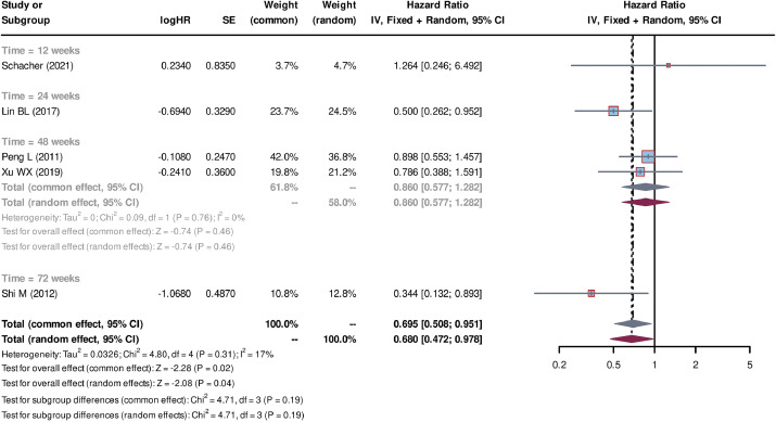 MELD評分在4周(WMD=-2.57)和24周(WMD=-4.12)時顯著降低,提示肝功能逐步恢復;