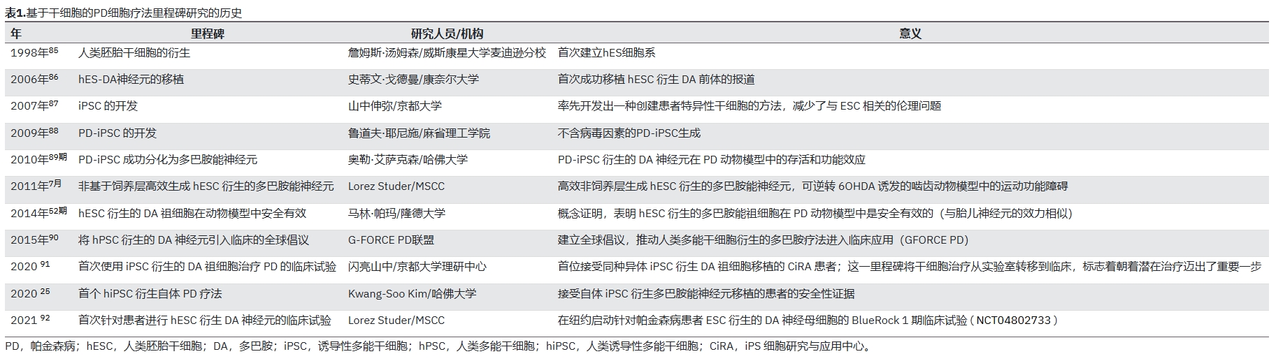 表1:基于干細胞的PD細胞療法里程碑研究的歷史
