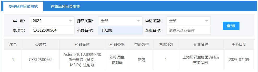 新增受理8:2025年07月09號,上海昂昇生物醫藥科技有限公司申報的“Astem-101人臍帶間充質干細胞(hUC-MSCs)注射液”的臨床試驗申請獲受理(受理號:CXSL2500564),這是該款細胞注射液第1次獲得受理。