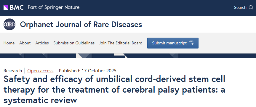 [1]:Salari, N., Morddarvanjoghi, F., Hosseinian-Far, A. et al. Safety and efficacy of umbilical cord-derived stem cell therapy for the treatment of cerebral palsy patients: a systematic review. Orphanet J Rare Dis 20, 518 (2025). https://doi.org/10.1186/s13023-025-04029-z