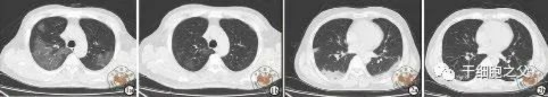 如圖所示,1a-1b:細胞輸注后,炎癥指標改善,復查胸部CT提示雙肺病灶較前吸收,呼吸道癥狀改善,新型冠狀病毒核酸檢測連續2次陰性,治愈出院。圖2a-2b:2次干細胞輸注后炎癥指標改善,復查時氧合指數升高至301 mmHg,胸部CT提示雙肺病灶較前吸收,患者呼吸道癥狀改善,新型冠狀病毒核酸檢測連續2次陰性,治愈出院。