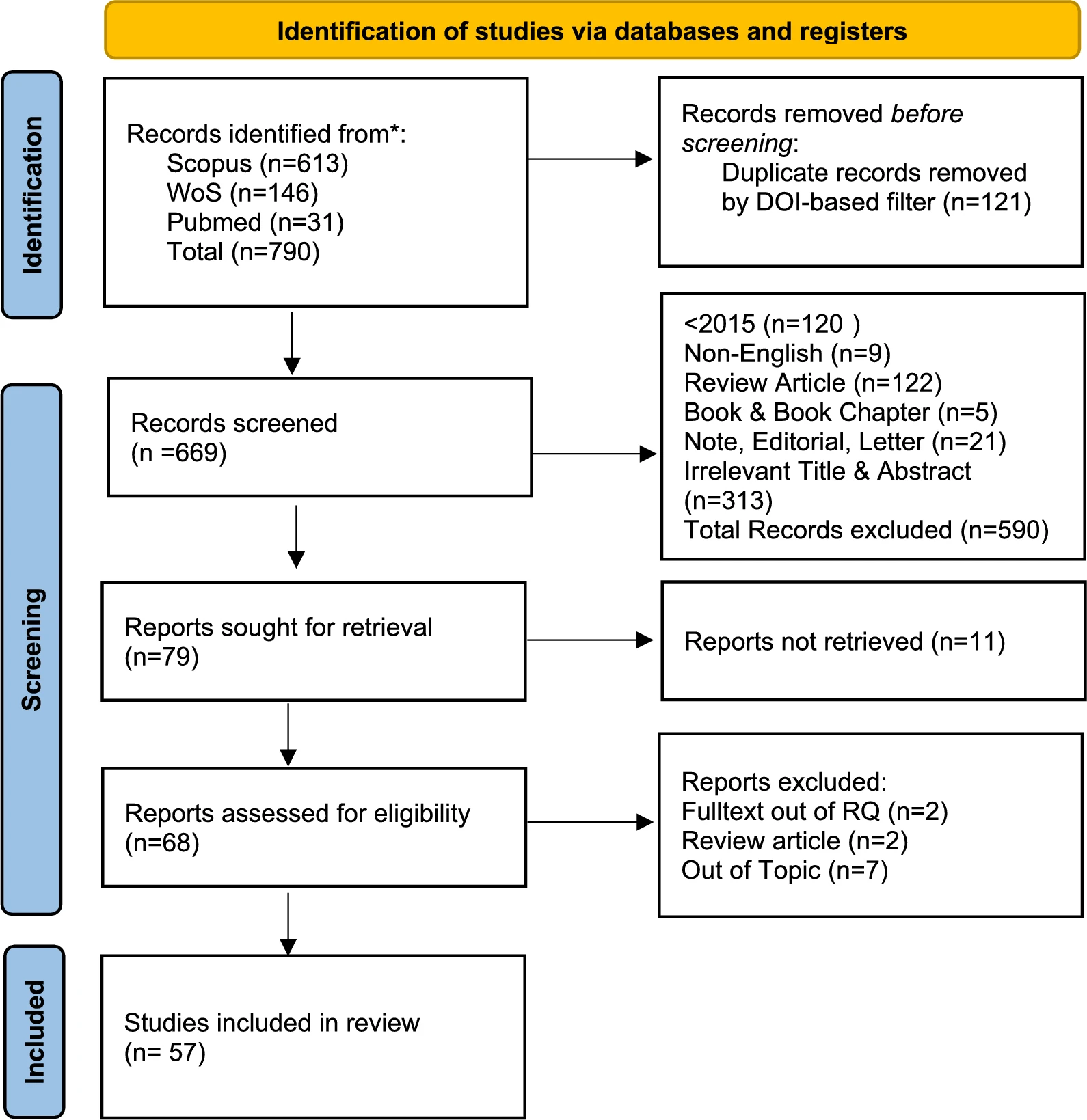本系統綜述通過檢索Scopus、Web of Science和PubMed三大數據庫,共識別出790篇相關文獻(圖1)。經自動去重程序(匹配DOI、標題、作者和年份等字段)剔除121篇重復文獻后,剩余669篇獨立文獻進入標題?摘要篩選階段。