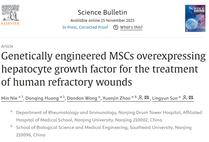 研究現狀:2025年11月,南京大學醫學院附屬南京鼓樓醫院孫凌云教授團隊在皮膚修復領域取得了一項國際矚目的突破性進展。他們自主研發了一種新型的工程化間充質干細胞(過表達肝細胞生長因子,即MSC-HGF),并將其應用于治療自身免疫病并發的大面積、難治性皮膚潰瘍。