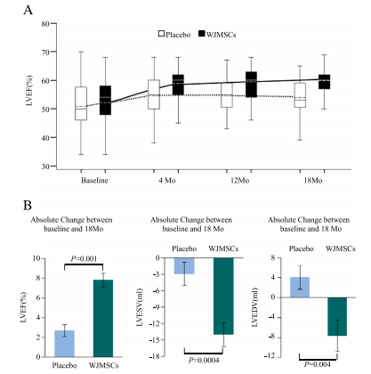 在隨訪的第3、6和12個月時經胸超聲心動圖和心臟MRI評估,只有經UC-MSCs治療組顯示出左心室射血分數的顯著改善。兩組間超聲心動圖左心室射血分數從基線到第12個月的變化差異顯著。