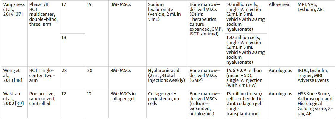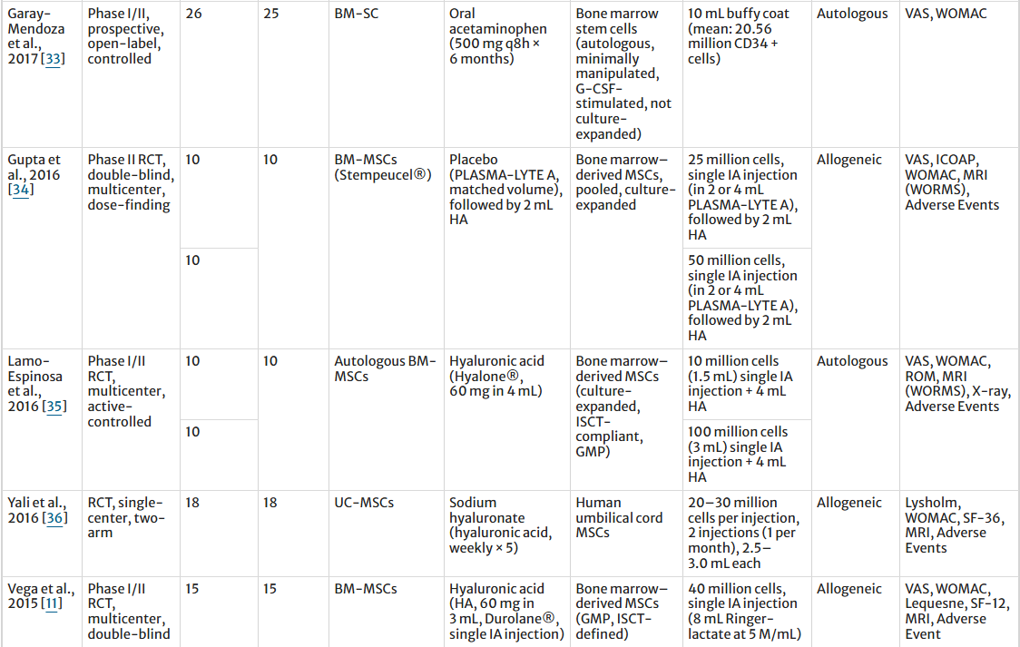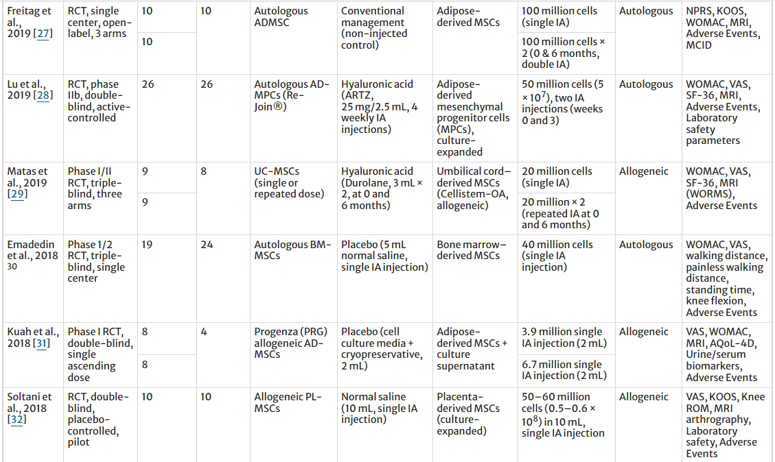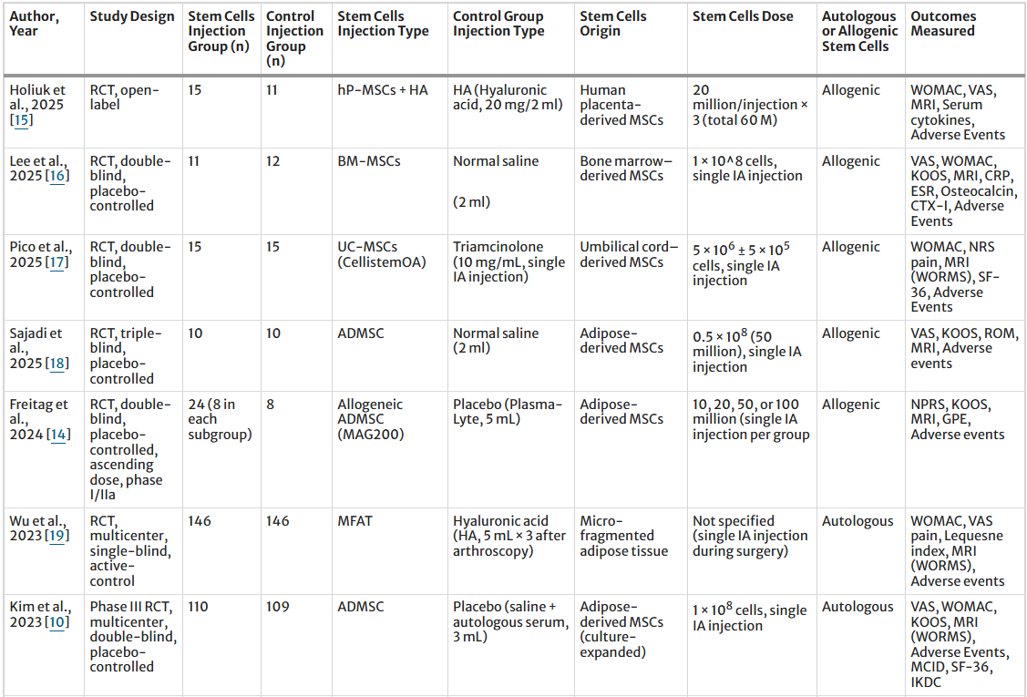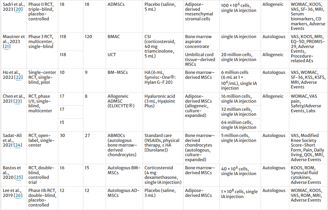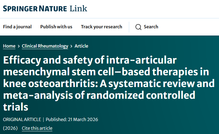 [1]:Awad, G., Saad, JP., Hamyeh, A. et al. Efficacy and safety of intra-articular mesenchymal stem cell–based therapies in knee osteoarthritis: A systematic review and meta-analysis of randomized controlled trials. Clin Rheumatol (2026). https://doi.org/10.1007/s10067-026-08042-w