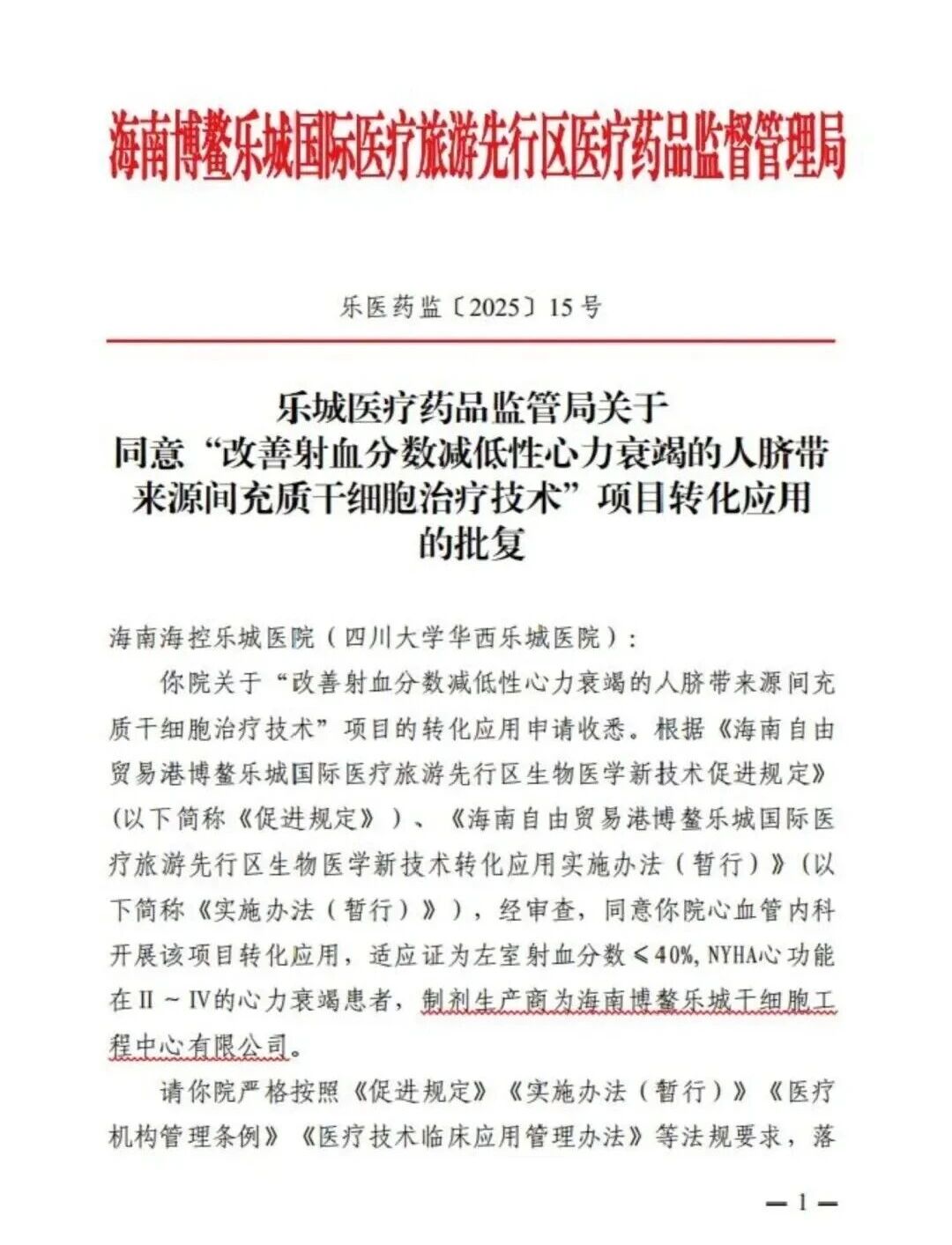 2025年2月13日,全國首個臍帶間充質干細胞治療心力衰竭項目在海南博鰲樂城國際醫療旅游先行區落地,由四川大學華西樂城醫院心血管內科實施。該項目已通過樂城醫療藥品監管局批復(樂醫藥監〔2025〕15號),為傳統治療無效的重癥患者提供了合規、可行的新選擇。