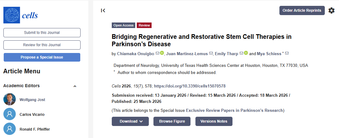 [1]:Onuigbo, C.; Martinez-Lemus, J.; Tharp, E.; Schiess, M. Bridging Regenerative and Restorative Stem Cell Therapies in Parkinson’s Disease. Cells 2026, 15, 578. https://doi.org/10.3390/cells15070578