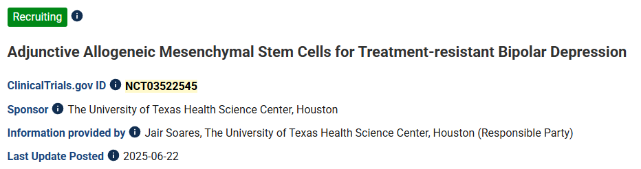 該研究計(jì)劃納入18至65歲、對(duì)至少兩種心境穩(wěn)定劑或抗抑郁藥應(yīng)答不佳的雙相I型或II型抑郁發(fā)作患者,隨機(jī)接受單次靜脈輸注異基因骨髓來(lái)源間充質(zhì)干細(xì)胞(MSCs)或安慰劑,主要評(píng)估8周內(nèi)蒙哥馬利-阿斯伯格抑郁評(píng)定量表(MADRS)評(píng)分的變化,同時(shí)監(jiān)測(cè)安全性指標(biāo)至26周。