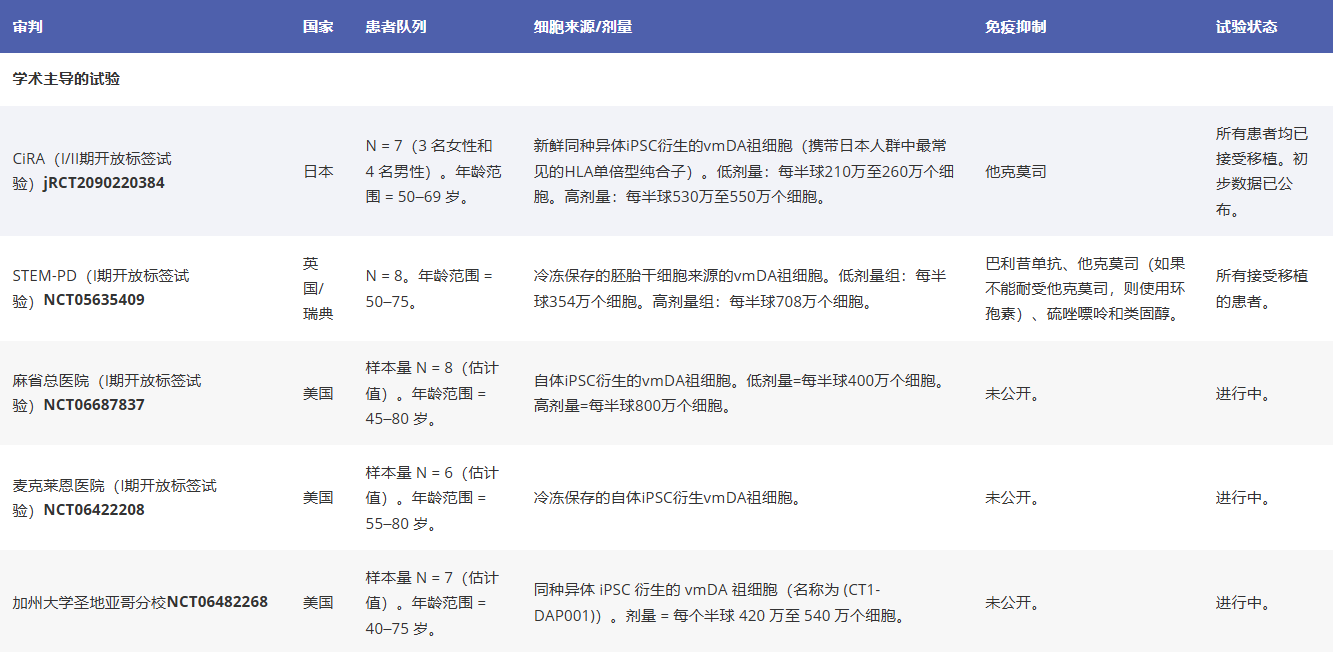 此后,美國、中國、歐洲和亞洲各地開展了多項類似試驗(見表1),包括由英國劍橋大學與瑞典隆德大學聯合開展的STEM-PD試驗。截至撰稿時,其中三項試驗的結果已發表于同行評審期刊。