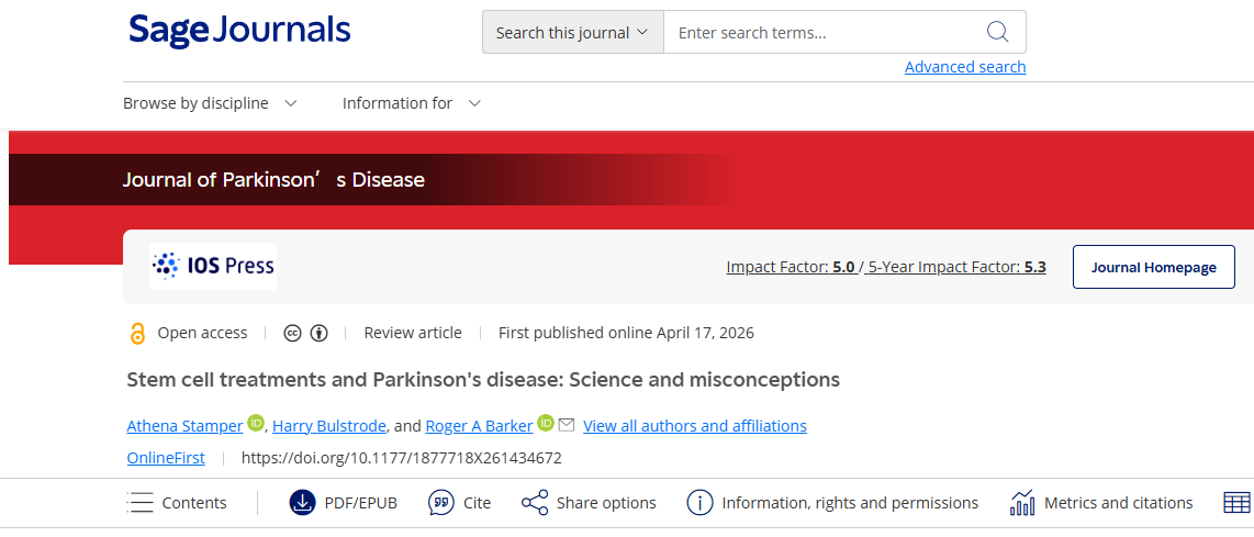 [1]:Stamper A, Bulstrode H, Barker RA. Stem cell treatments and Parkinson’s disease: Science and misconceptions. Journal of Parkinson’s Disease. 2026;0(0). doi:10.1177/1877718X261434672