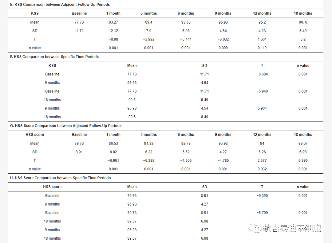 KSS和HSS分數(shù):經(jīng)過18個月的隨訪,患者的KSS從77.73±11.71提高到90.6±6.49,HSS評分從79.73±8.91提高到89.07±6.98。注射前和注射后18個月的評分之間存在顯著差異(p<0.05,如表2?(E–H) 和圖3所示)。
