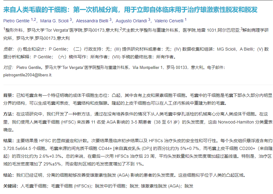 這些研究人員開發了一種在從人類毛囊中收集活組織檢查后使用離心分離人類成體干細胞的方法。研究人員總結他們的發現,“我們已經證明,分離的細胞能夠改善受雄激素性脫發 (AGA) 影響的患者的頭發密度?!?/p>