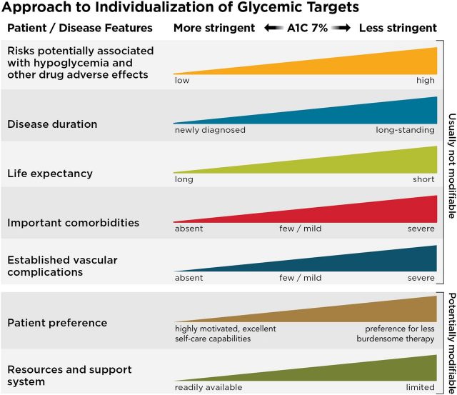 官方建議確實(shí)有一些回旋余地。美國糖尿病協(xié)會的這張圖表列出了一些其他因素,這些因素可能表明患者何時應(yīng)該以較低(或較高)的血糖水平為目標(biāo):
