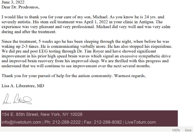 “普羅德羅莫斯博士說:”我們在安提瓜提供的簡單間充質(zhì)干細(xì)胞療法對治療自閉癥始終有效。”在我們正在進(jìn)行的臨床試驗中,89%的患者記錄并維持了顯著的改善。 改善最常見的形式是更加平靜、睡眠更好和社交溝通得到改善。