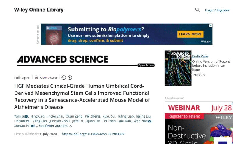 2020年7月6日,國際學(xué)術(shù)期刊《Advanced Science》在線發(fā)表了軍事科學(xué)院軍事醫(yī)學(xué)研究所和華南干細(xì)胞與再生醫(yī)學(xué)研究中心的最新研究成果HGF介導(dǎo)臨床級(jí)人臍帶間充質(zhì)干細(xì)胞改善功能恢復(fù)在衰老加速的阿爾茨海默氏病小鼠模型中”。