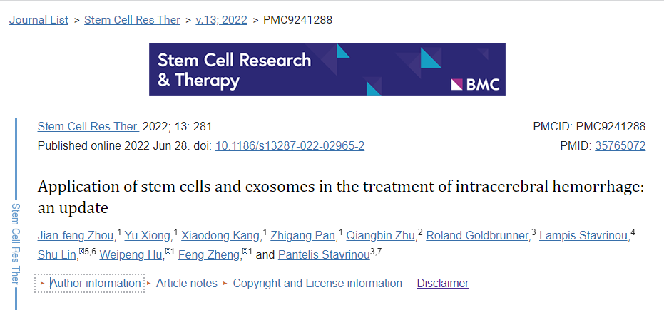 參考資料:Zhou JF, Xiong Y, Kang X, Pan Z, Zhu Q, Goldbrunner R, Stavrinou L, Lin S, Hu W, Zheng F, Stavrinou P. Application of stem cells and exosomes in the treatment of intracerebral hemorrhage: an update. Stem Cell Res Ther. 2022 Jun 28;13(1):281. doi: 10.1186/s13287-022-02965-2. PMID: 35765072; PMCID: PMC9241288.