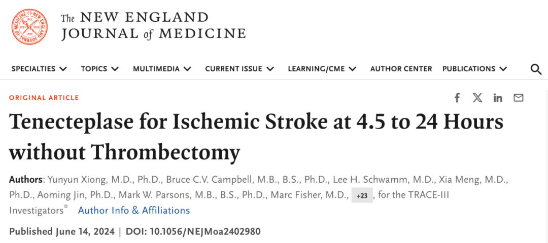這一突破性更新基于首都醫(yī)科大學(xué)附屬北京天壇醫(yī)院王擁軍教授團隊于2024年6月15日在《NEJM》發(fā)表的重磅研究成果Tenecteplase for lschemic Stroke at4.5 to 24 Hours without Thrombectomy (TRACE-Ⅲ 研究)。[10]