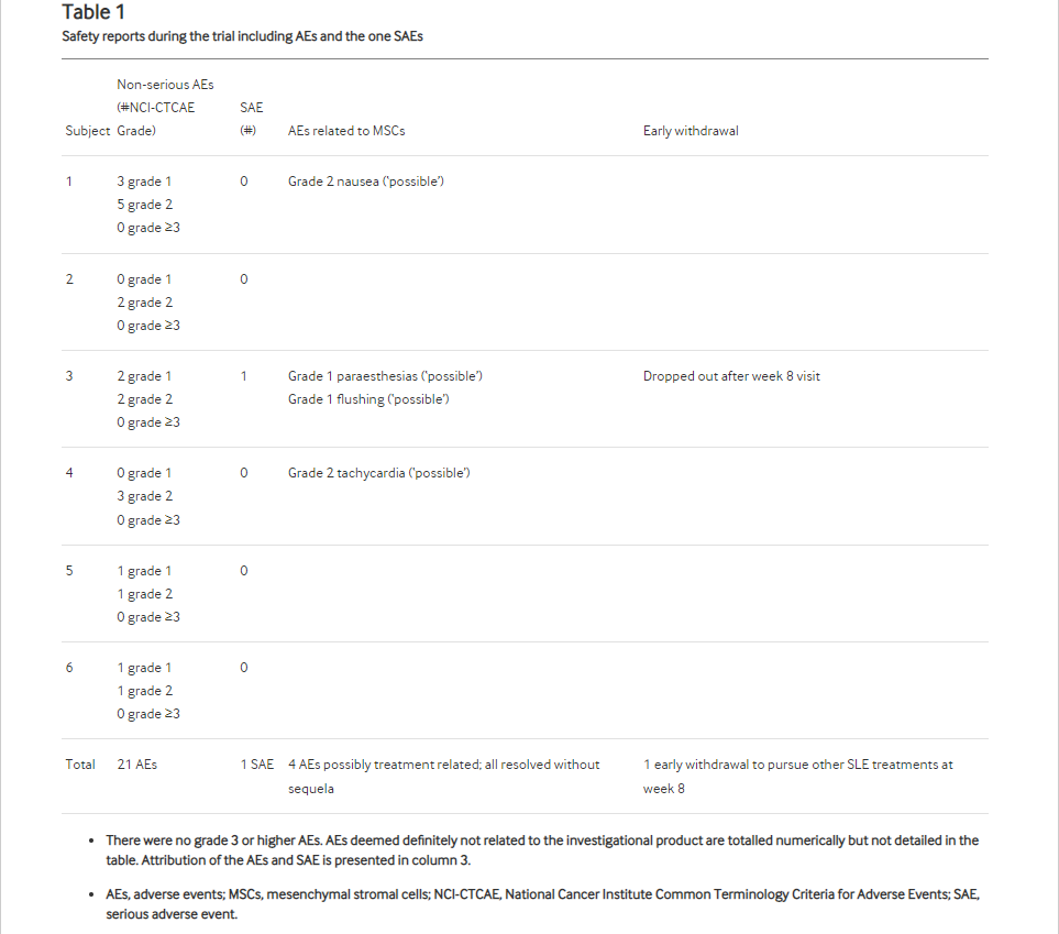 • 這項(xiàng)研究增加了對(duì)混合種族隊(duì)列中MSC安全性和免疫活性的評(píng)估。MSC輸注后B細(xì)胞和GARP的變化是新穎的且之前未報(bào)道過。盡管這一I期試驗(yàn)無法進(jìn)行療效評(píng)估,但缺乏可歸因的不良事件以及5/6患者獲得SRI4的結(jié)果支持需要在更大規(guī)模的對(duì)照試驗(yàn)中進(jìn)一步評(píng)估療效和毒性。