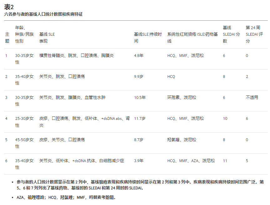 入組的6名患者均為女性,平均年齡38歲(范圍26-48歲)。兩名參與者是非裔美國人,一名是西班牙裔,三名是白人。平均病程為8.2年(范圍為3.9-11.7年)。一名患者在兒童時(shí)期發(fā)病。基線疾病特征見表2。盡管進(jìn)行了免疫抑制和生物治療,一名患者仍出現(xiàn)難治性橫貫性脊髓炎發(fā)作。一名患有腎臟疾病的患者在接受霉苯酯 (MMF) 治療后持續(xù)出現(xiàn)蛋白尿。除一名患者外,所有患者均服用羥氯喹和潑尼松。兩名患者使用MMF,一名患者使用硫唑嘌呤和MMF,一名患者使用環(huán)孢菌素。其中兩人因多次免疫抑制治療方案失敗而未服用免疫抑制劑。在整個(gè)試驗(yàn)過程中,所有患者均繼續(xù)接受基線藥物治療。
